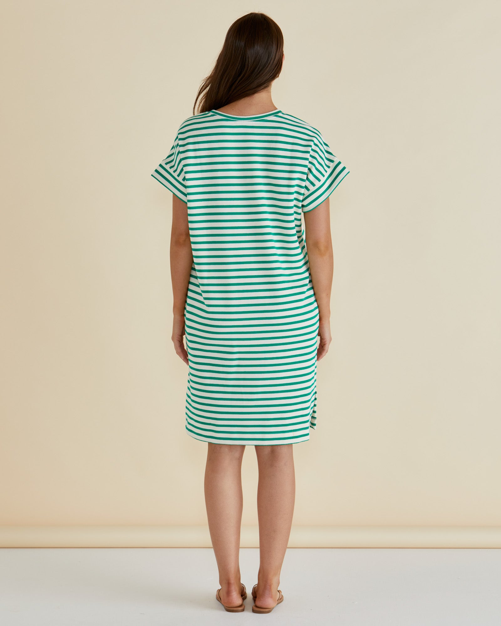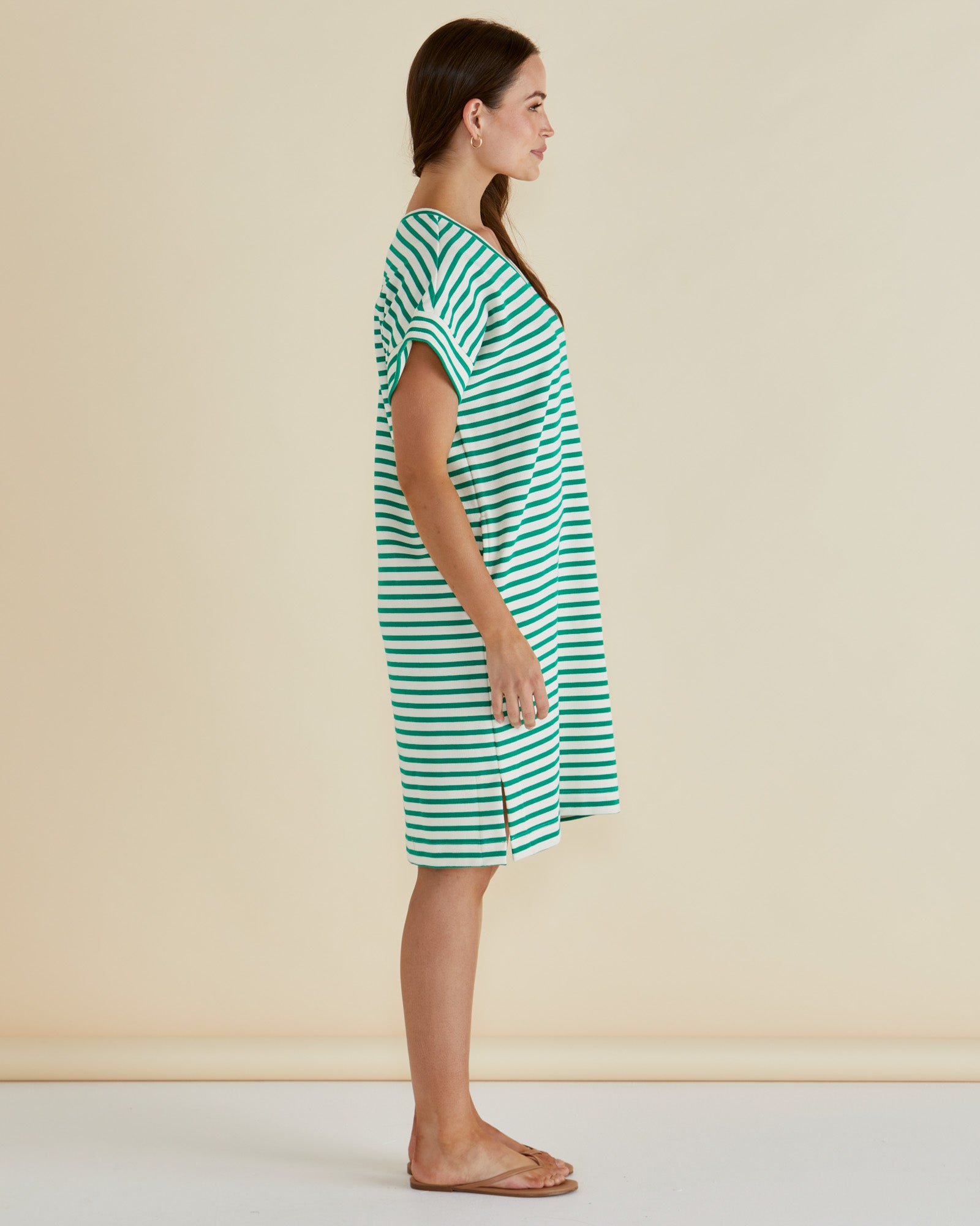 Betty Basics Elise V Neck Rib Dress Green Stripe. The Elise V-Neck Rib Dress is your new go-to for everyday wear. With its V-neckline, cap cuff sleeves, and side splits, this dress offers a relaxed yet stylish look, complete with pockets for added convenience.