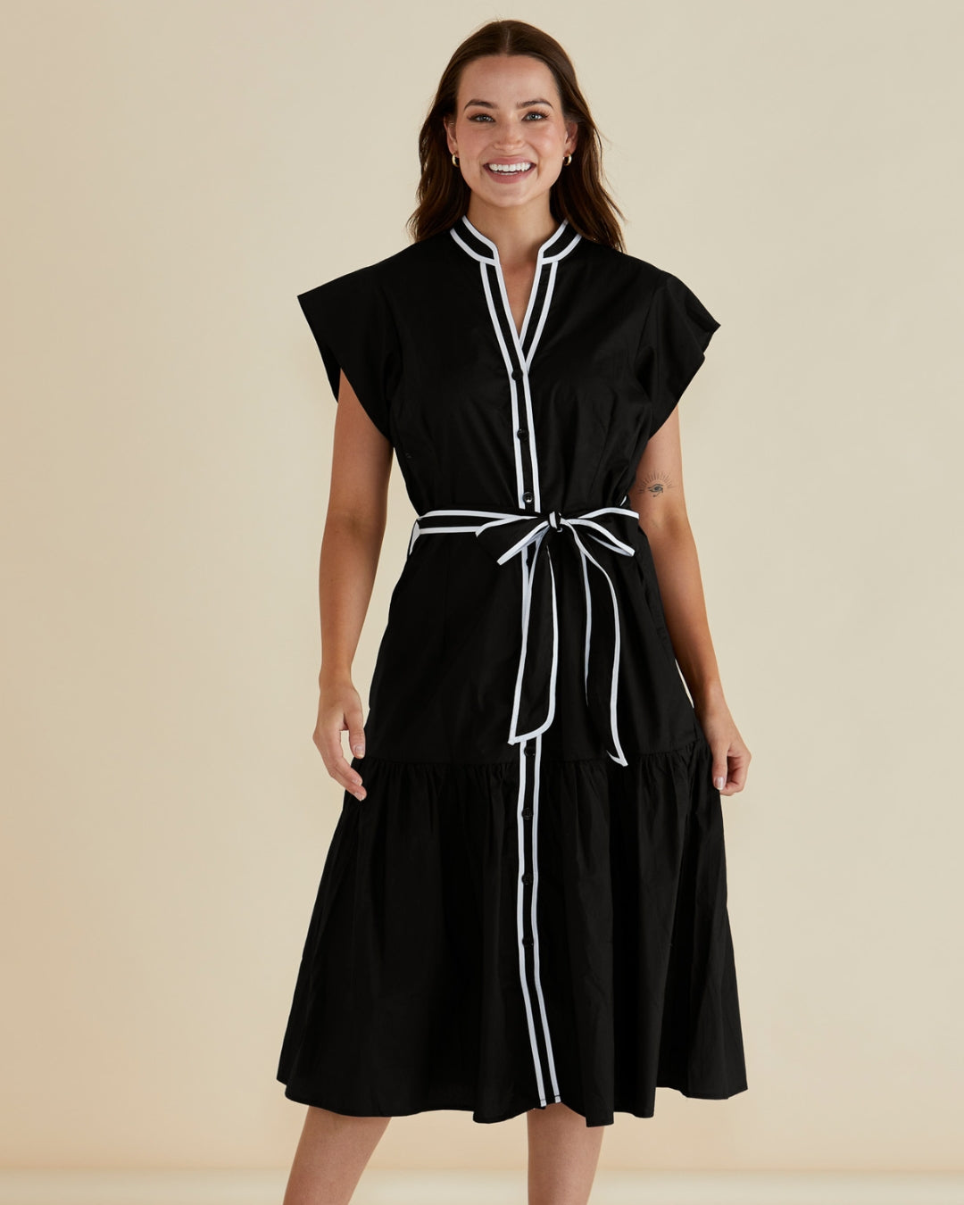 Betty Basics Mari Dress Black and White. The Mari Dress is crafted from structured cotton poplin for a crisp, polished look. Featuring a button-up front with V-neckline and detachable waist tie, it offers classic, elevated style with relaxed ease. Short sleeves and a versatile silhouette make it an effortless transeasonal choice.