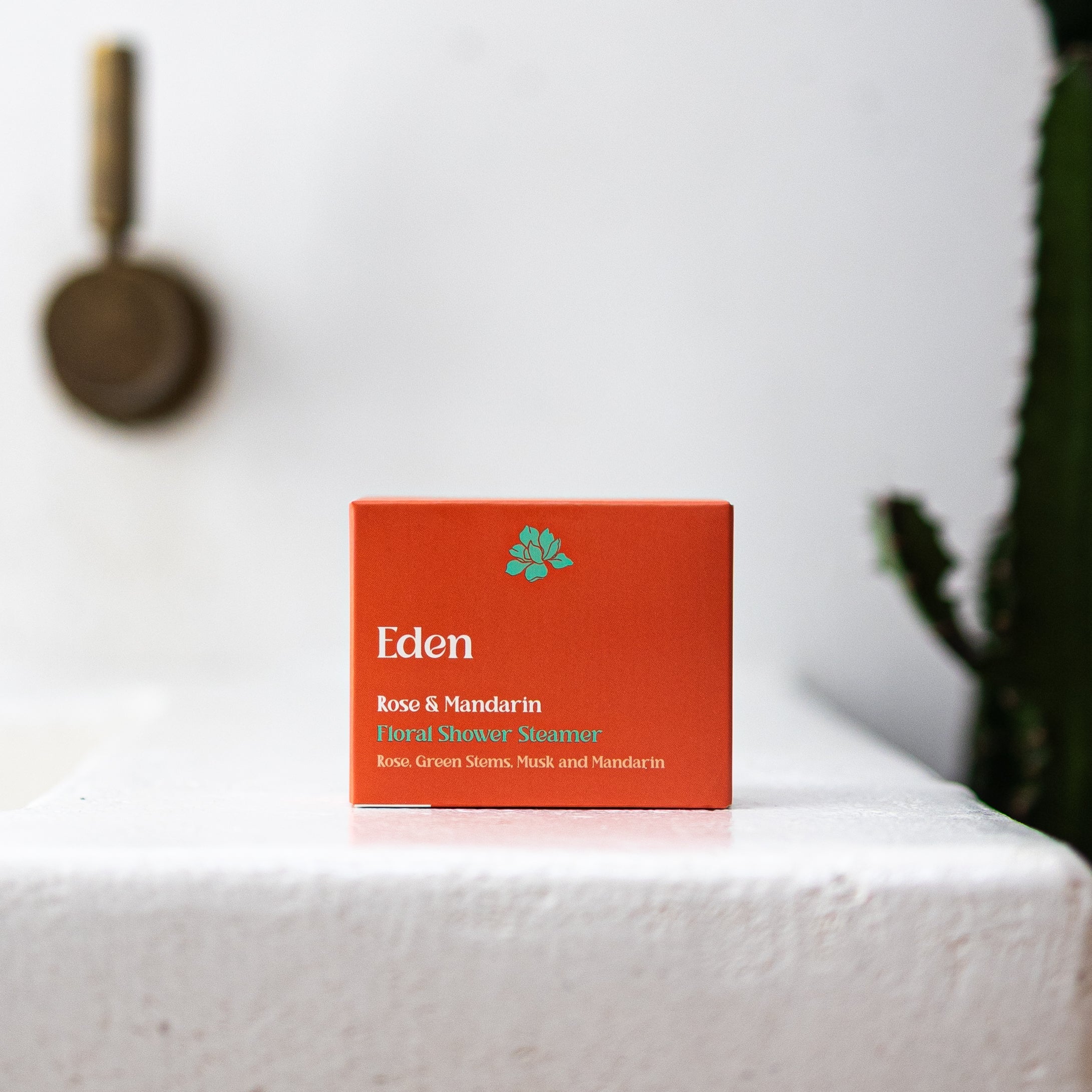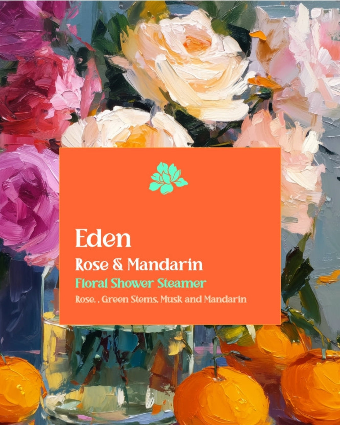 Blume and Body Shower Steamer Eden. Rose & Mandarin Floral Shower Steamer The ultimate floral aroma essential oil shower steamer with blooming notes of rose, lilies, daisies, green stems, musk and fruity mandarin