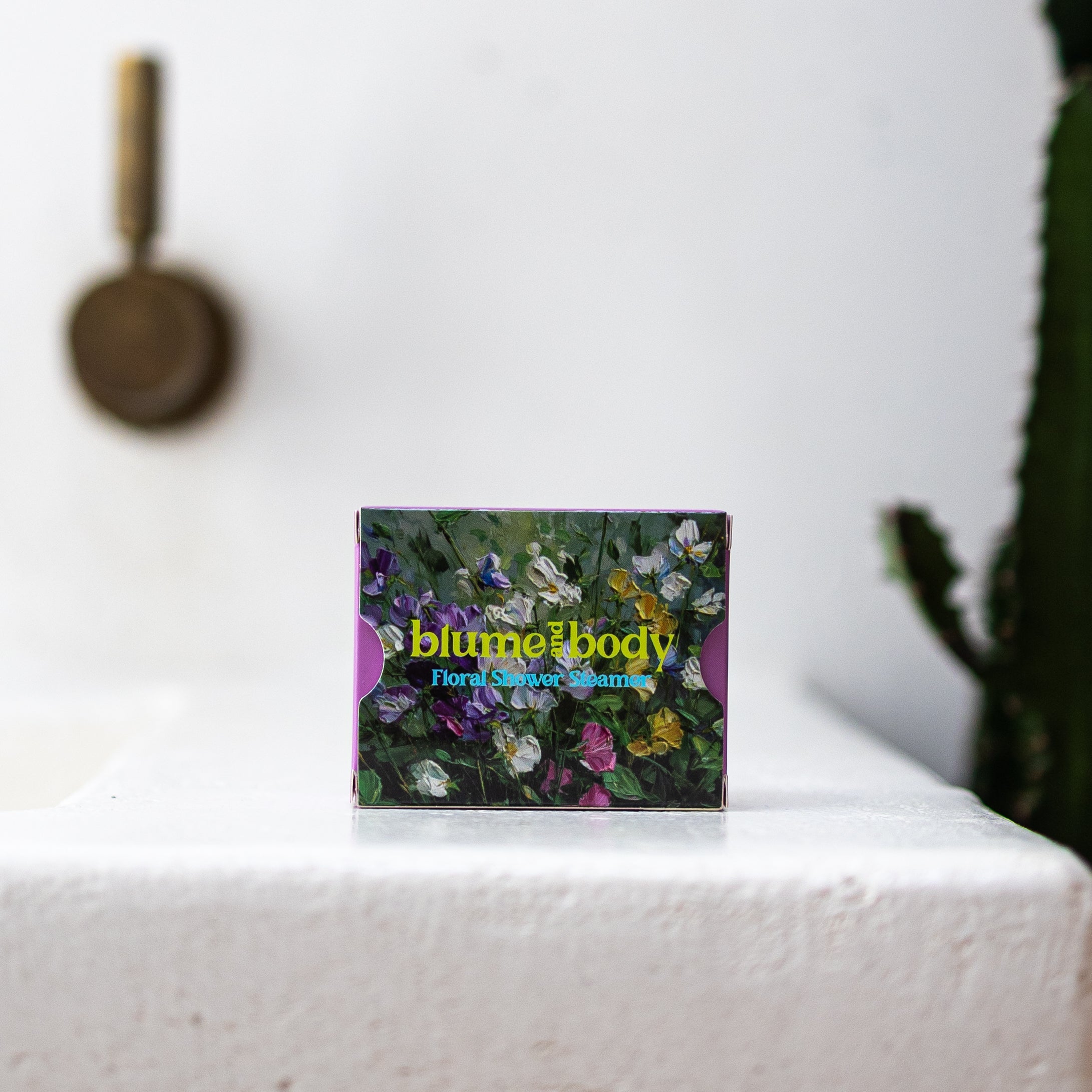 Blume and Body Shower Steamer Whisper. Sweet Pea & Jasmine Floral Shower Steamer A sweet and floral aroma essential oil shower steamer with blushing jasmine, sweet pea flowers, raspberry and vanilla notes