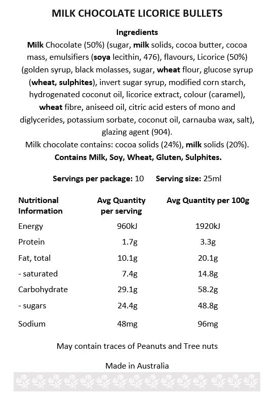 Dark Chocolate Jumbo Licorice Bullets. These only appear in Chambers once a year and we have a huge following on these delicious jumbo and we mean like really jumbo bullets. The perfect gift. 200gms
