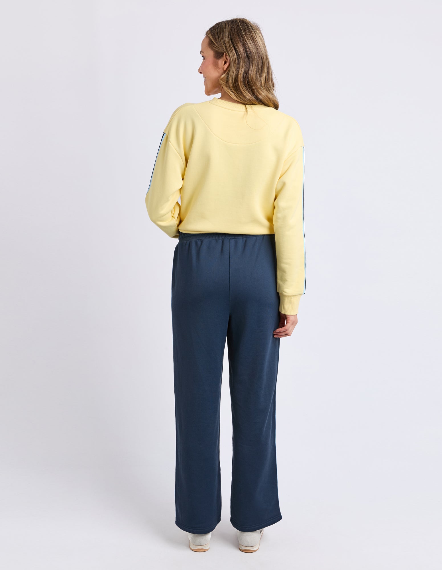 Elm Amara Trackpants Navy. The Elm Amara Track Pant blends comfort with sporty style. Featuring a relaxed fit, elastic waistband and full-length design, these trackpants are finished with a stripe down the side seam. Pair them with a matching crew or classic tee for an effortlessly cool daywear look.