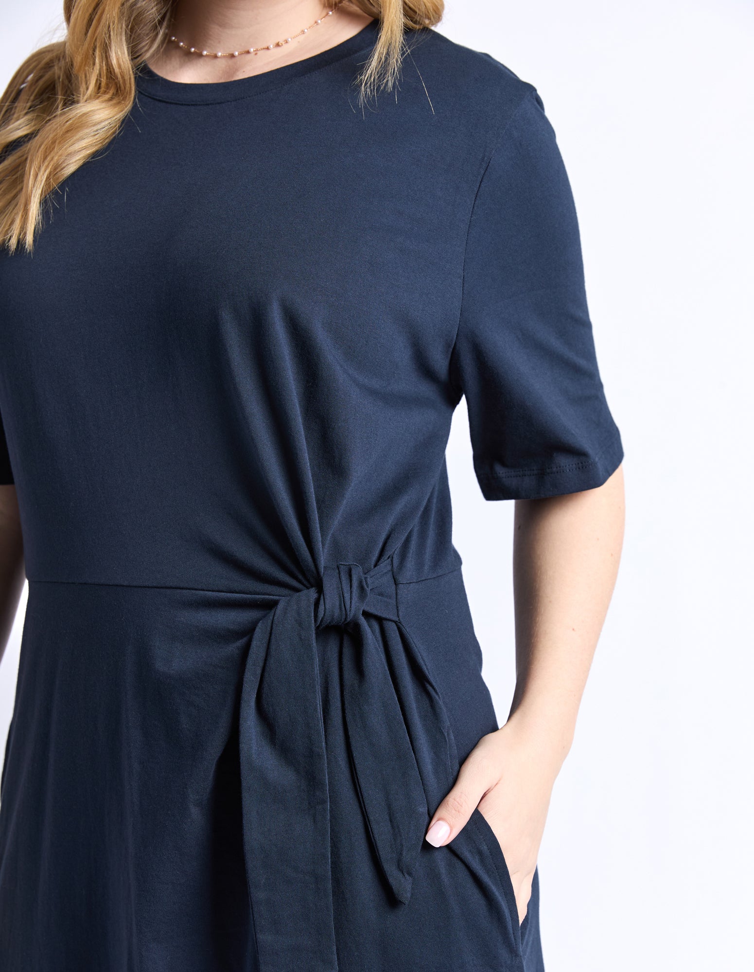Elm Picnic Dress Navy. A cute as can be 100% cotton dress that is the ultimate throw on and go piece for your Spring/Summer wardrobe. The Picnic Dress features a fun knot at the waist providing shape and finesse to this super comfortable 100% cotton tee dress.