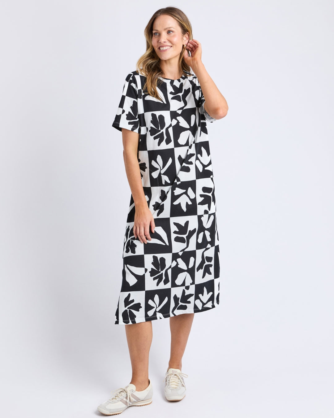 Elm Splice Dress Black and White. Featuring an exclusive Elm Print in timeless black and white, the Splice Dress is an effortless piece for everyday wear. Relaxed fit in 100% Cotton.