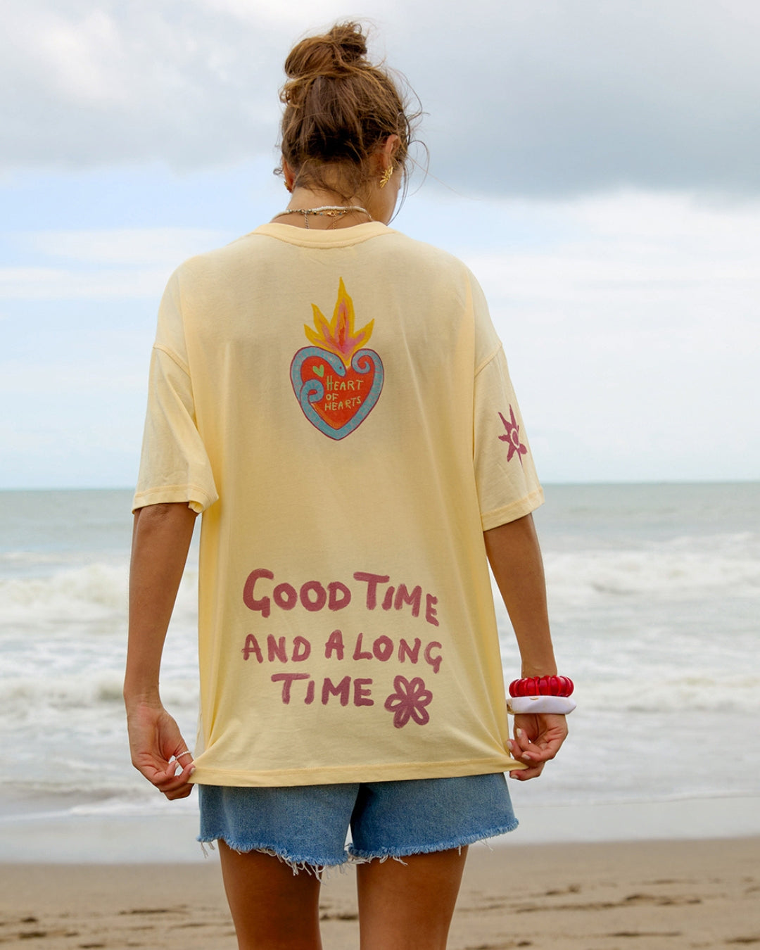 Foxwood Studio Series Heart of Hearts Lemon. Here for a good time and maybe a long time too. The Heart of Hearts Tee is all love and good energy with its hand drawn artwork and vintage beach club vibe. Soft cotton, easy oversized fit and a little bit of cheeky charm. Made for golden hours, loud laughter and living straight from the heart.