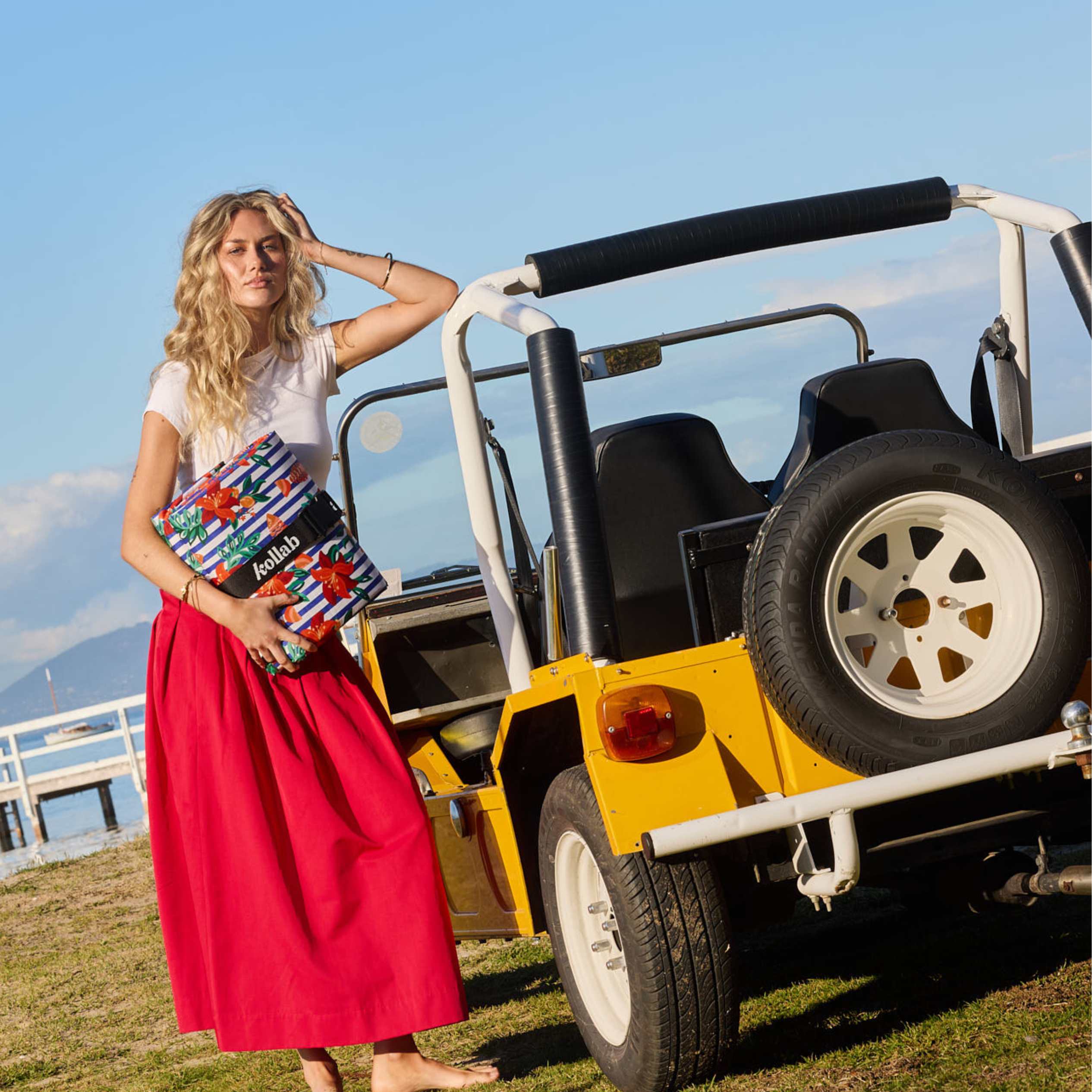 Kollab Picnic Mat Mykonos. The bestselling Kollab Picnic Mat to share with your family and friends. Finally, a mat that really is big, water resistant and easy to fold! Having been frustrated with most large picnic mats out there that need to be folded up in the exact same way, we designed our picnic mats with an adjustable strap so that they don’t need to be folded in any specific way. Just fold or roll it up however you please and adjust the strap to suit. The water-resistant fabrication makes it the perfect partner for the beach or park and squishy foam lining makes it soft and comfortable to sit or lay on.