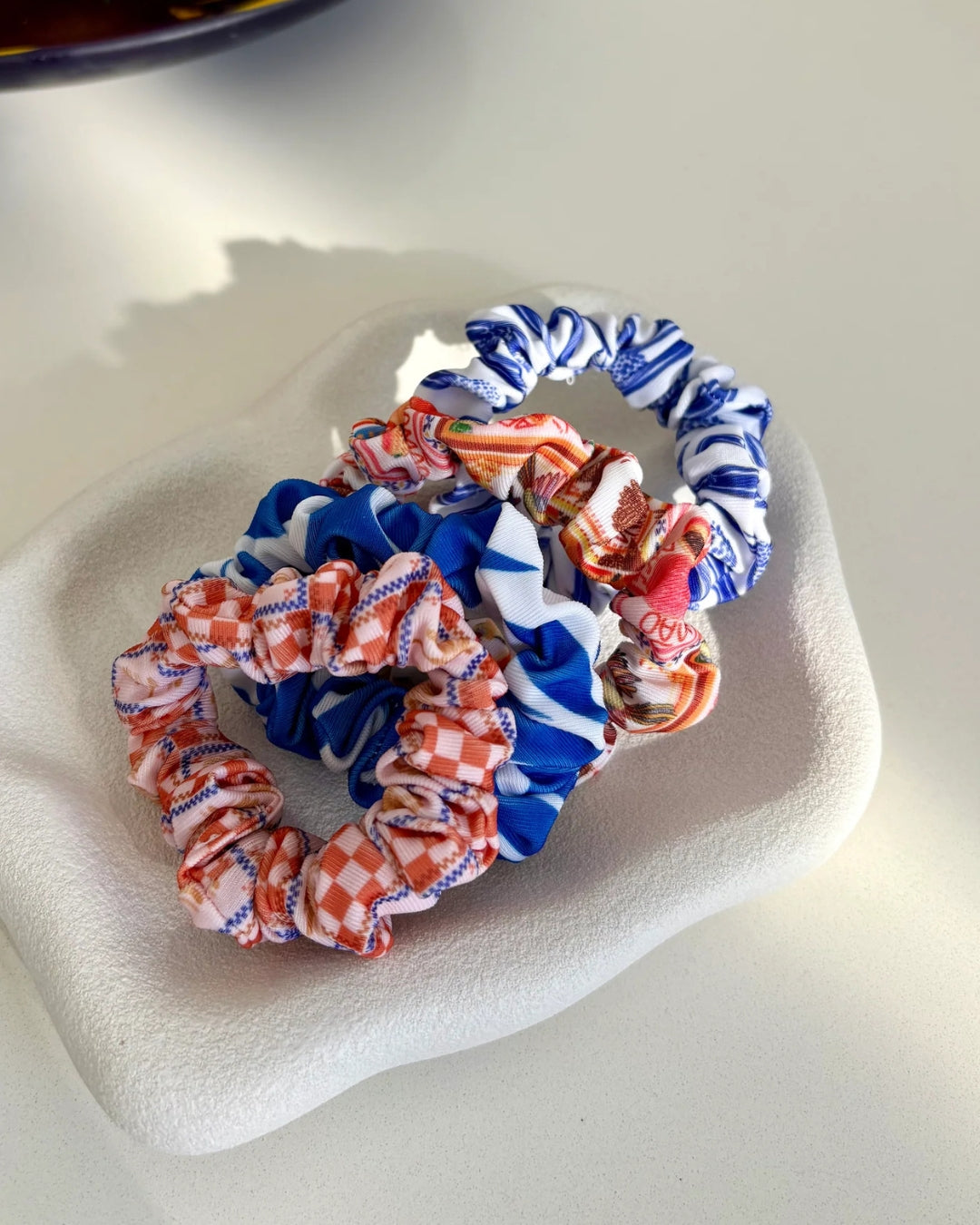 Louvelle Blue/Orange Scrunchie Set. Add a pop of colour to your hair tie game! Made from louvelles stretchy swim fabric, these soft and quick dry scrunchies will hold your pony or bun securely and are gentle on your previous strands, avoiding breakage to your hair.