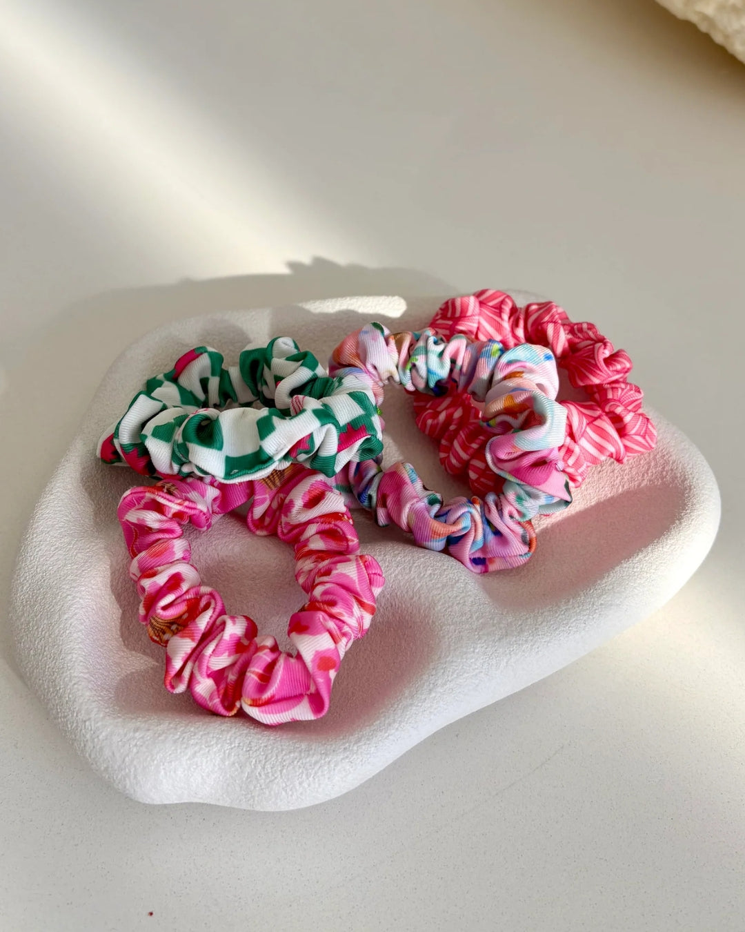 Louvelle Pink/Green Scrunchie Set. Add a pop of colour to your hair tie game! Made from louvelles stretchy swim fabric, these soft and quick dry scrunchies will hold your pony or bun securely and are gentle on your previous strands, avoiding breakage to your hair.