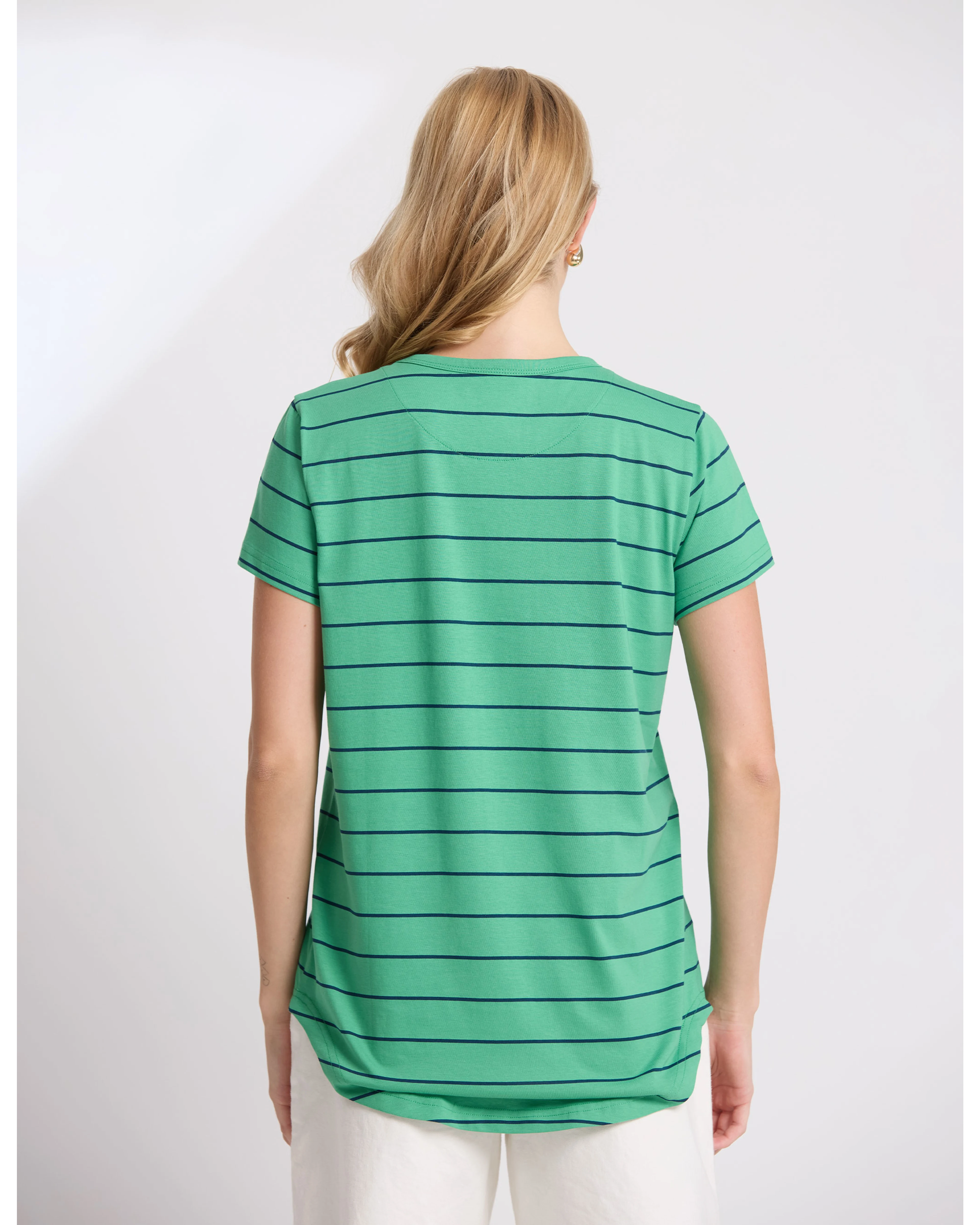 Stella and Gemma Classic T Shirt Green and Navy Stripe. Crew neck striped t-shirt with hi-lo hemline in 95% Cotton and 5% Spandex.