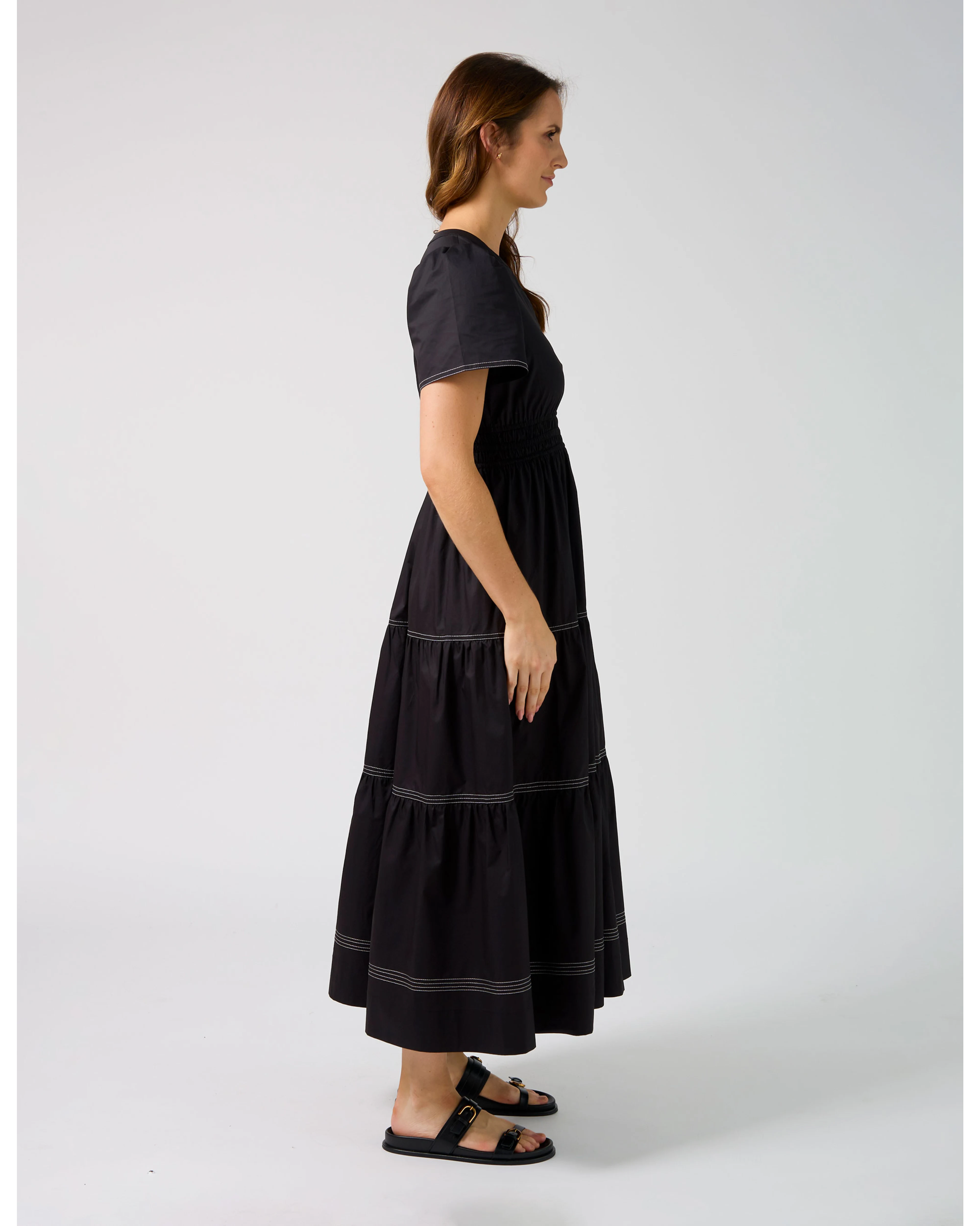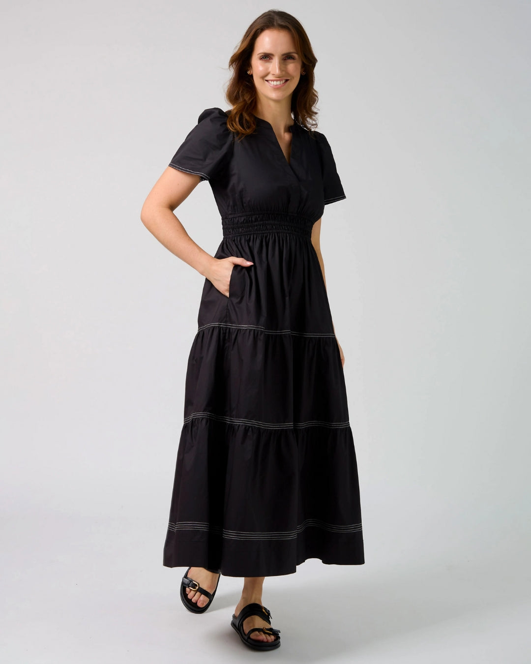 Stella and Gemma Vittoria Dress Black. Our best selling dress design is back and finally in black Grab it while you can it will sell out. V neck tiered maxi dress with fitted upper bodice , puffed sleeves and elasticated waist