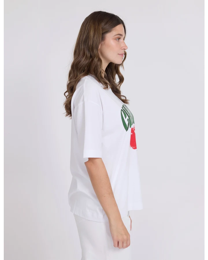 Stella and Gemma White Cherries T Shirt. A super cool new style of T Shirt from Stella and Gemma the Porter t shirt is a relaxed more oversized boxy fit crew neck with drop shoulder sleeves in 100% Cotton.