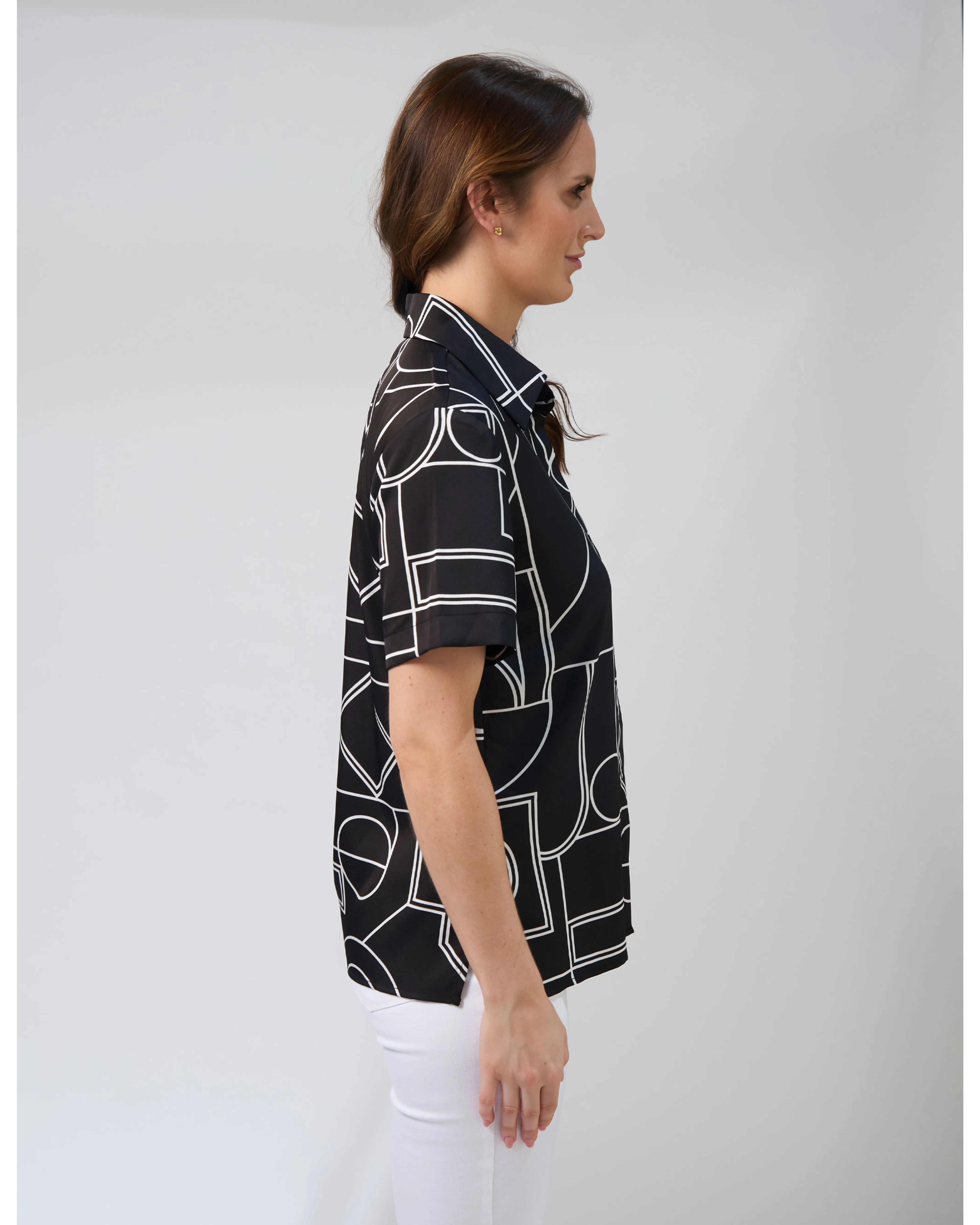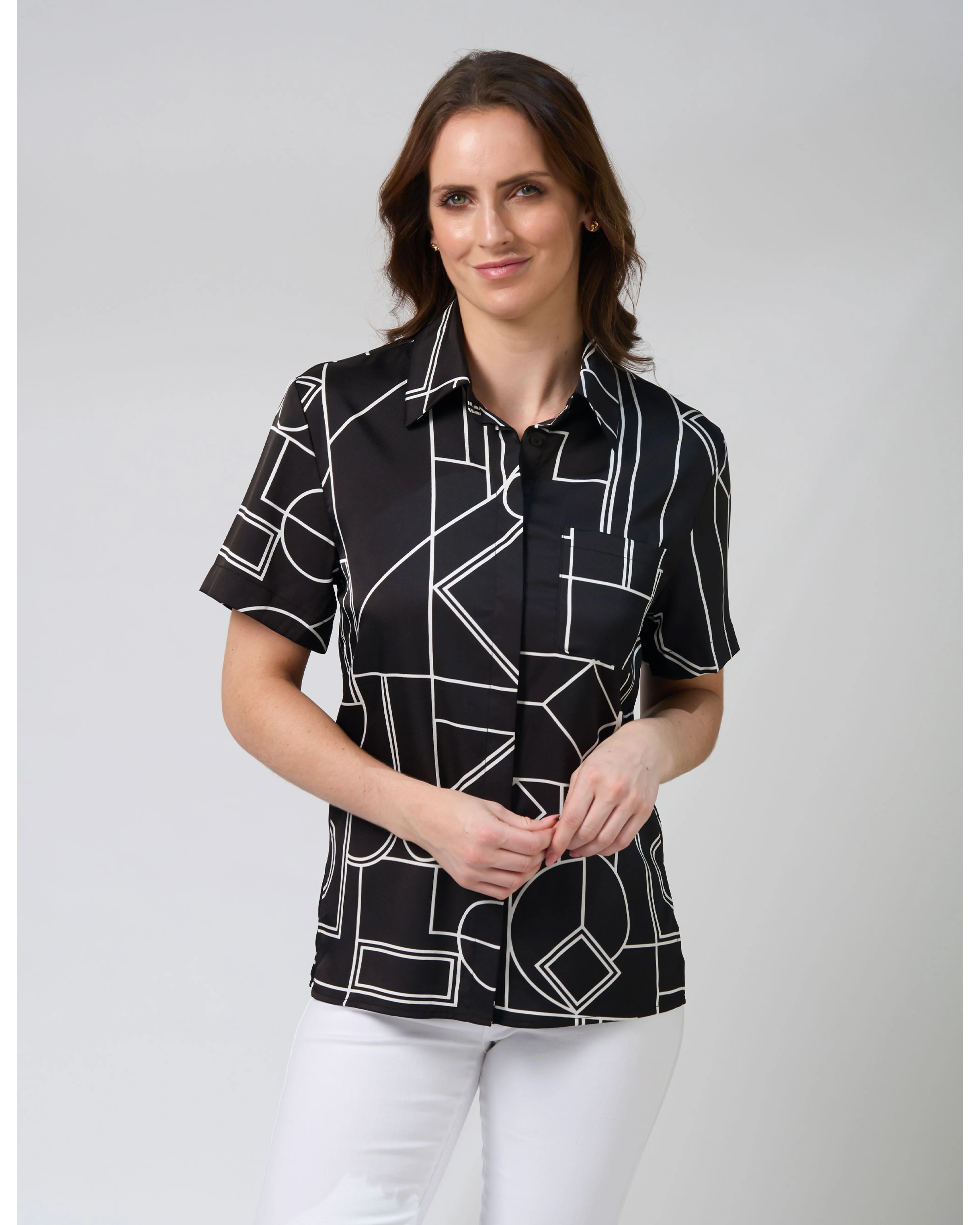 Stella and Gemma Alisa Blouse Spring Street. Super cute new short sleeve collared shirt with button front concealed placket in polyester. Team back with the matching pants to complete the look.