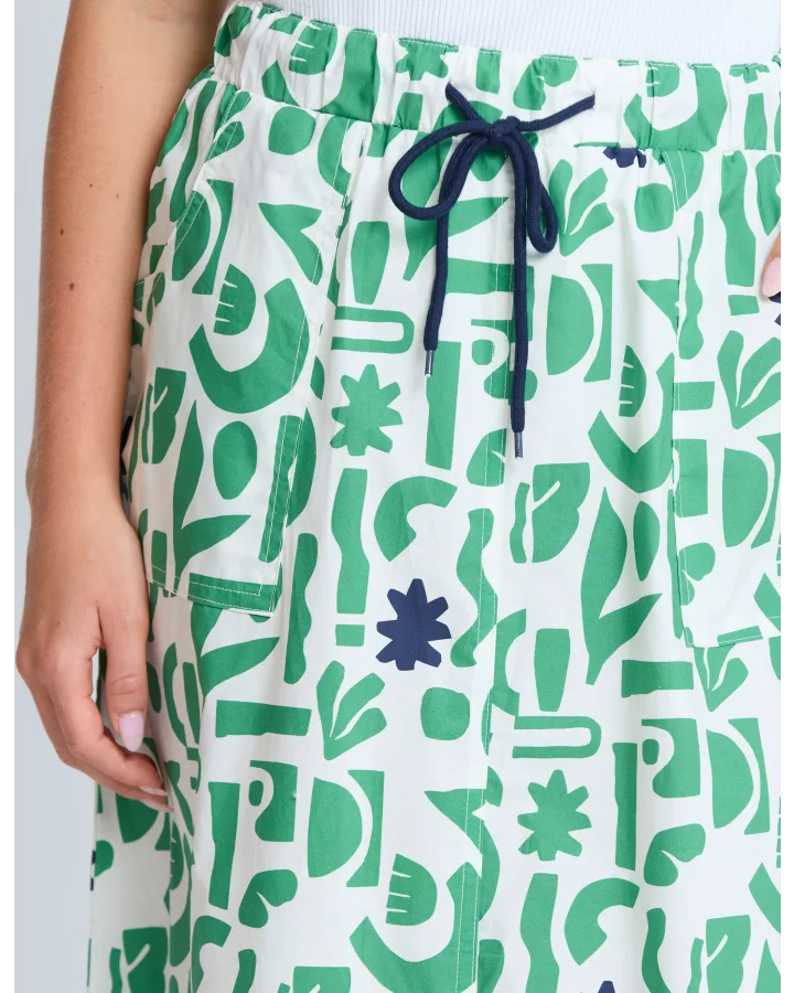 Stella and Gemma Amy Skirt Spring Green Geo. 100% Cotton midi Length Skirt With Elasticated Waist And Contrast Drawcord Tie. Front Scoop Pockets And Centre Front Split At Hemline.