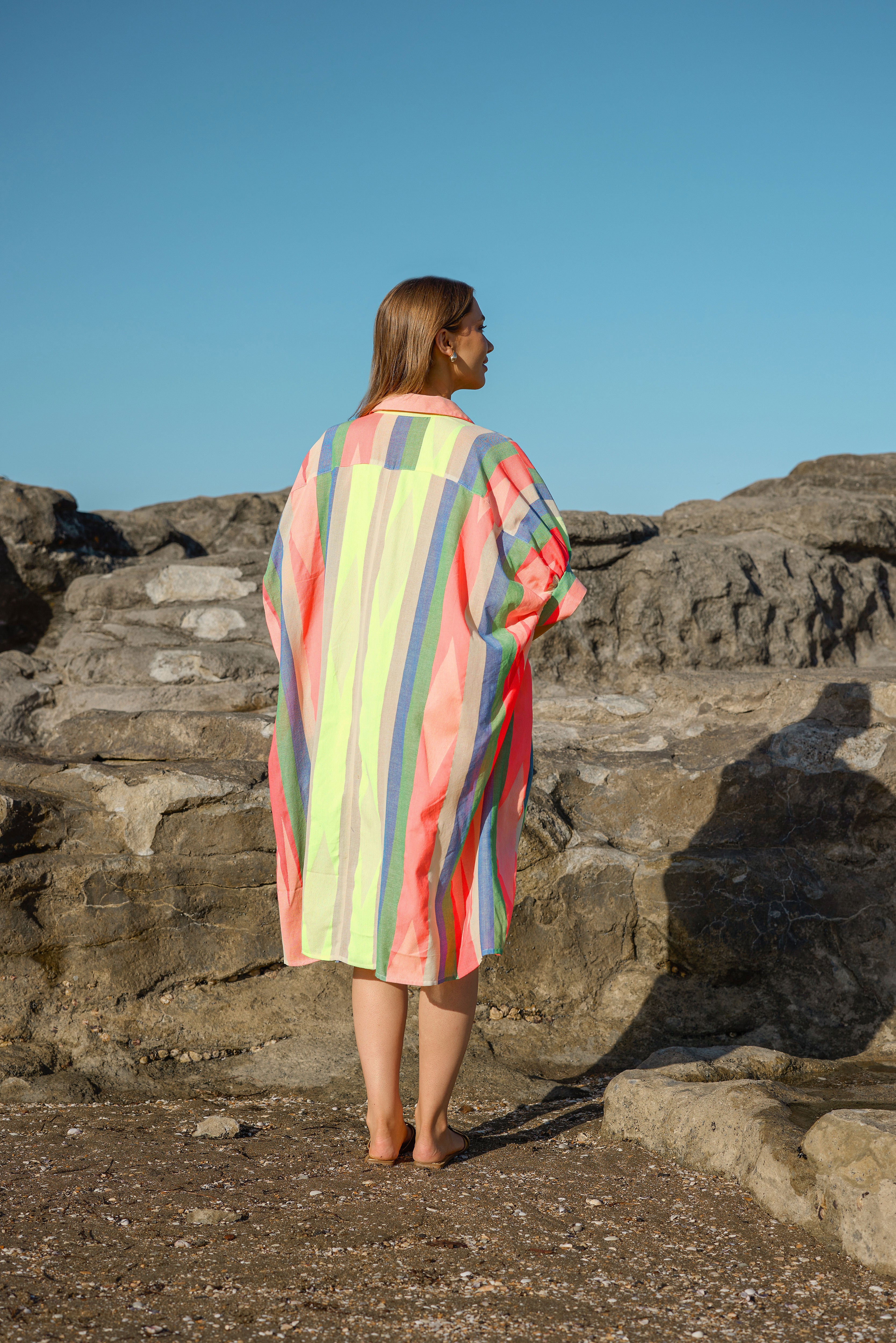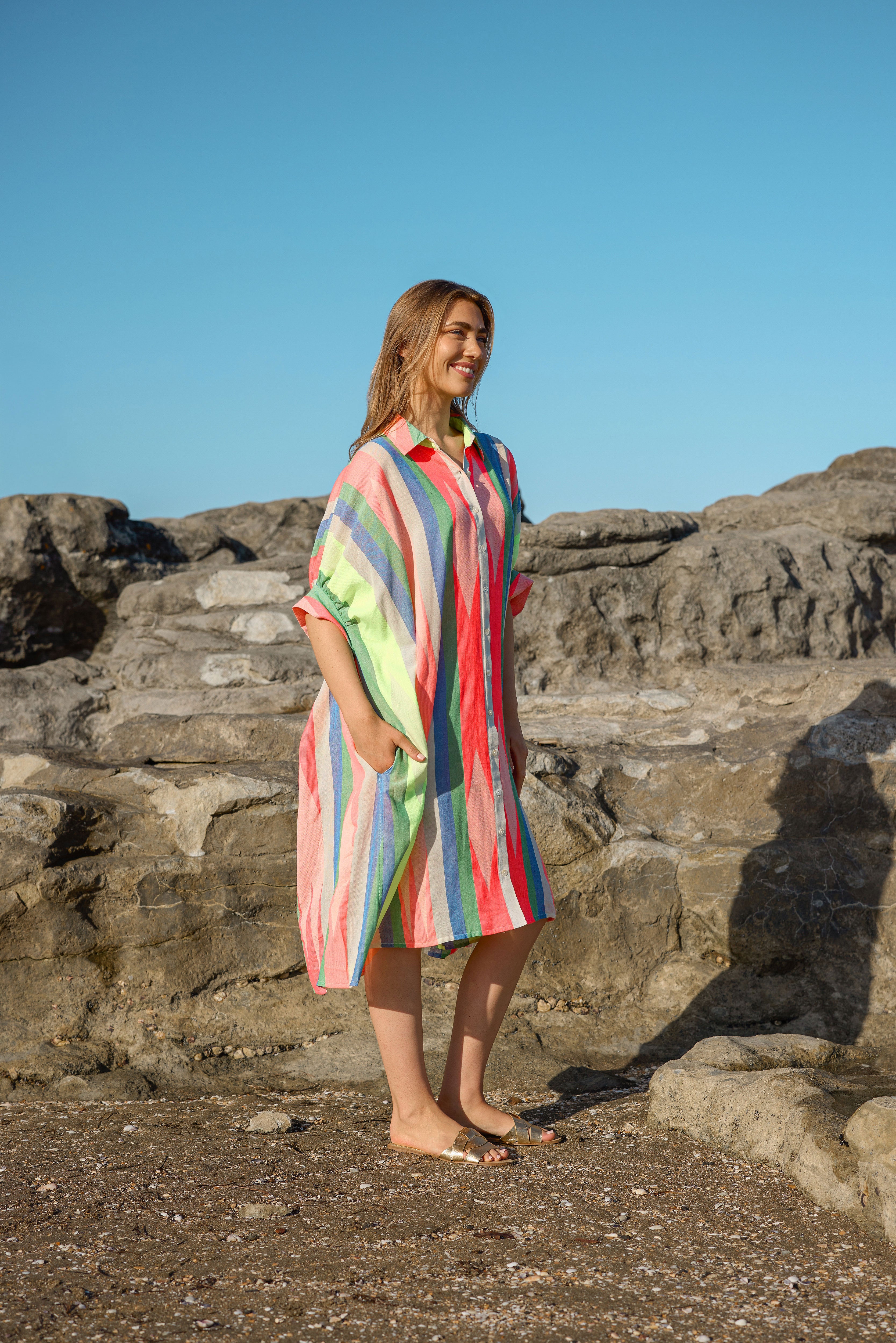 Stella and Gemma Bahamas Dress Multi. Oversized button front collared shirt dress with gathered cuff detail. One size fits most in 100% Cotton
