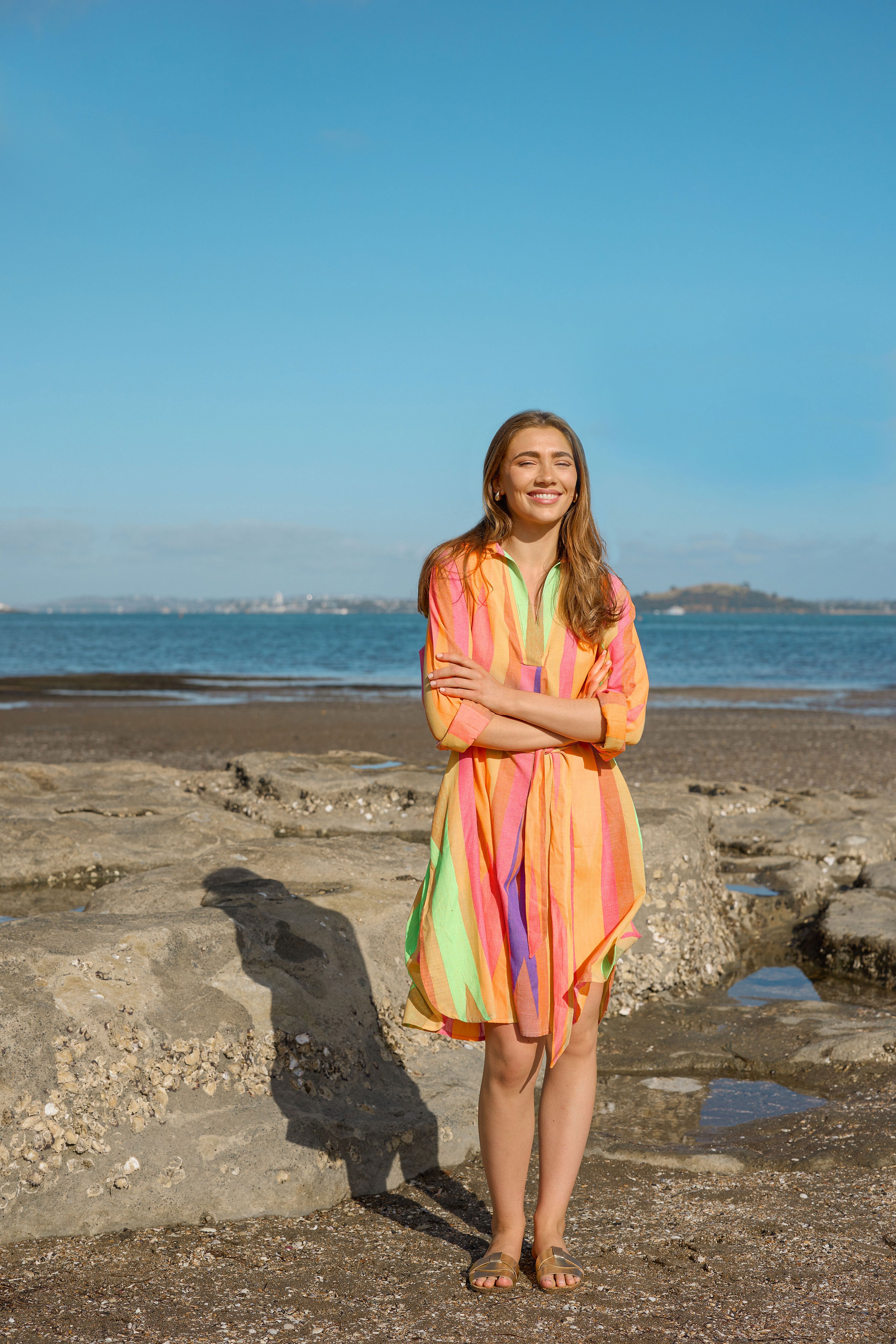 Stella and Gemma Cayman Shirt Dress Multi. Open collared v neck knee length dress with curved shirt tail hem and self fabric tie belt in 100% Cotton.