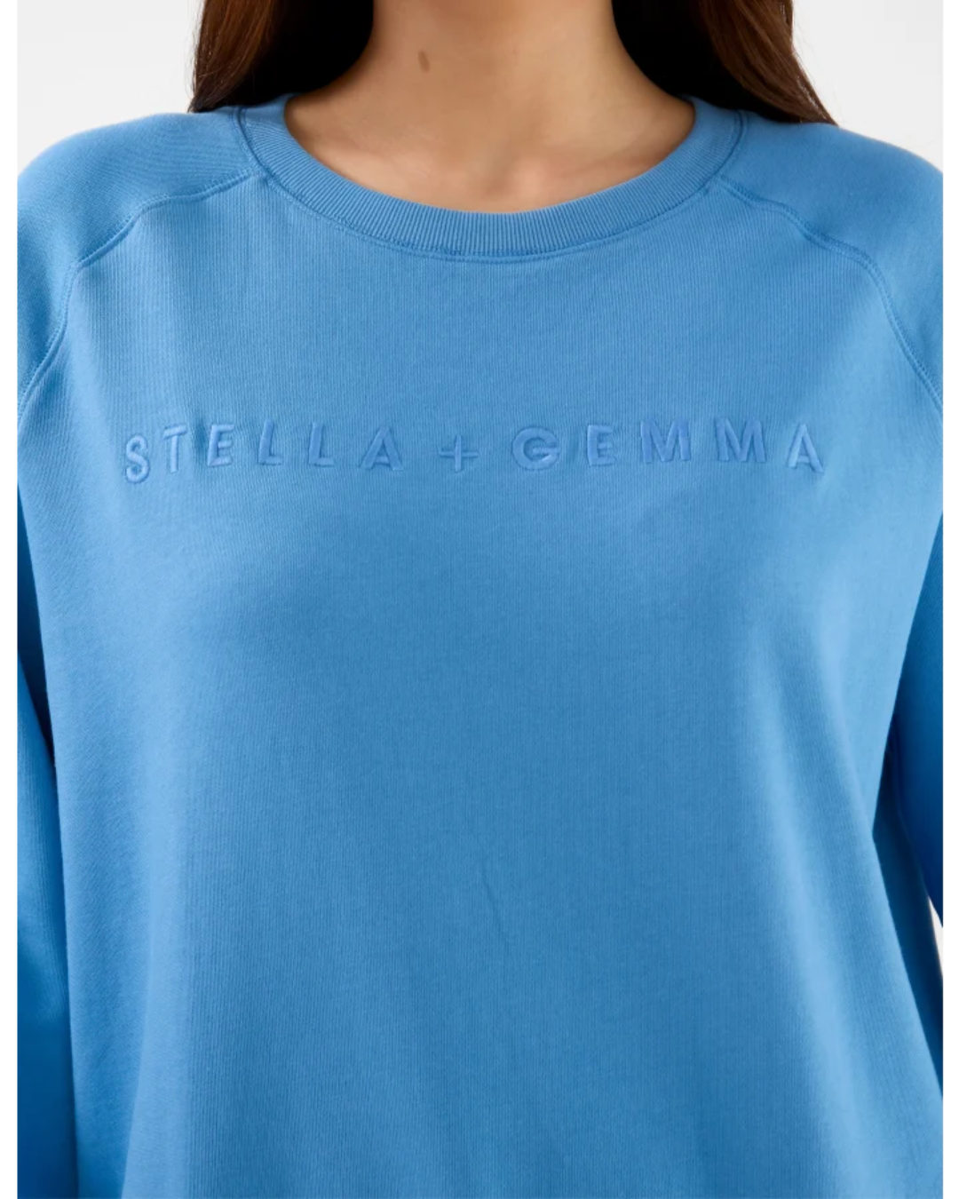 Stella and Gemma Classic Sweatshirt Sky Logo. 100% Cotton relaxed fit classic sweater with Stella & Gemma embossed logo on front raglan seams, rib cuffs & hem. Fits true to size, choose your normal size for a relaxed fit.