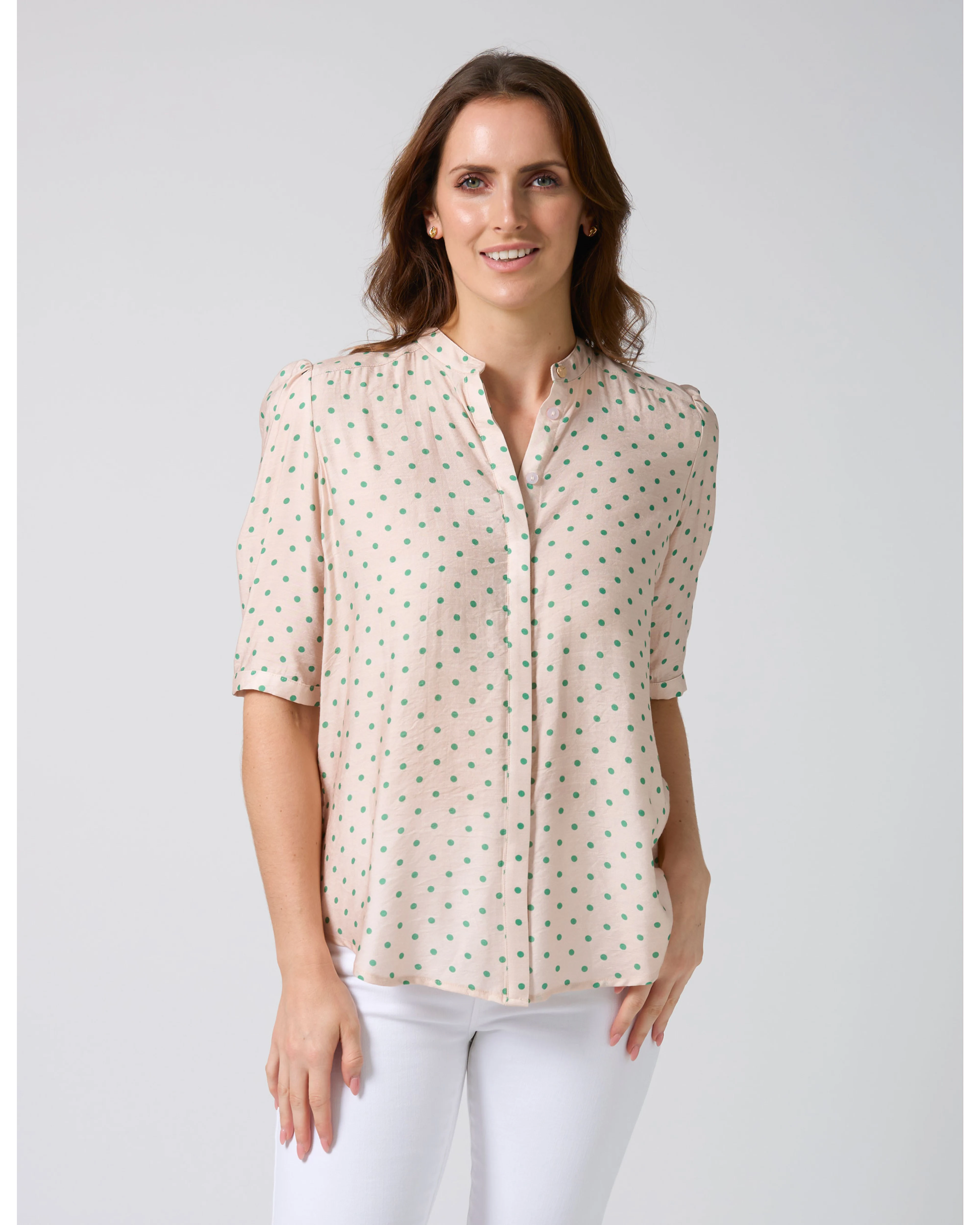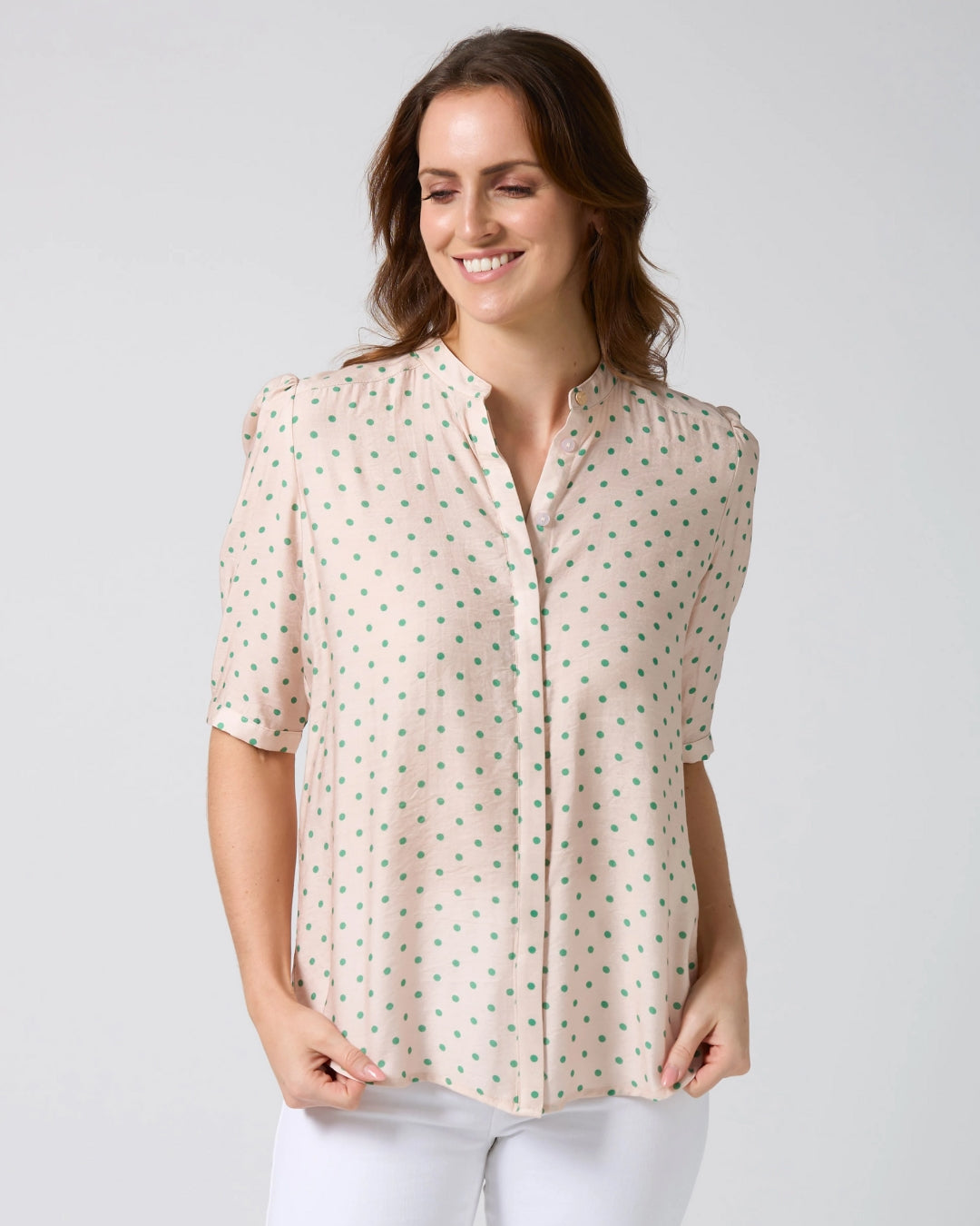 Stella and Gemma Cassie Blouse Peppermint Pattie. New from Stella and Gemma this gorgeous mandarin collared blouse with concealed placket and sleeve is sure to be a staple in your Spring wardrobe. Slightly curved hemline and gold logo button at top neck in 85% viscose and 15% nylon.