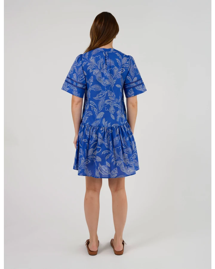 Stella and Gemma Eugenie Dress Corfu Cobalt. V neck knee length dress with concealed button placket, tiered skirt and ladder stitch detail through a fluted sleeve in 100% Cotton.