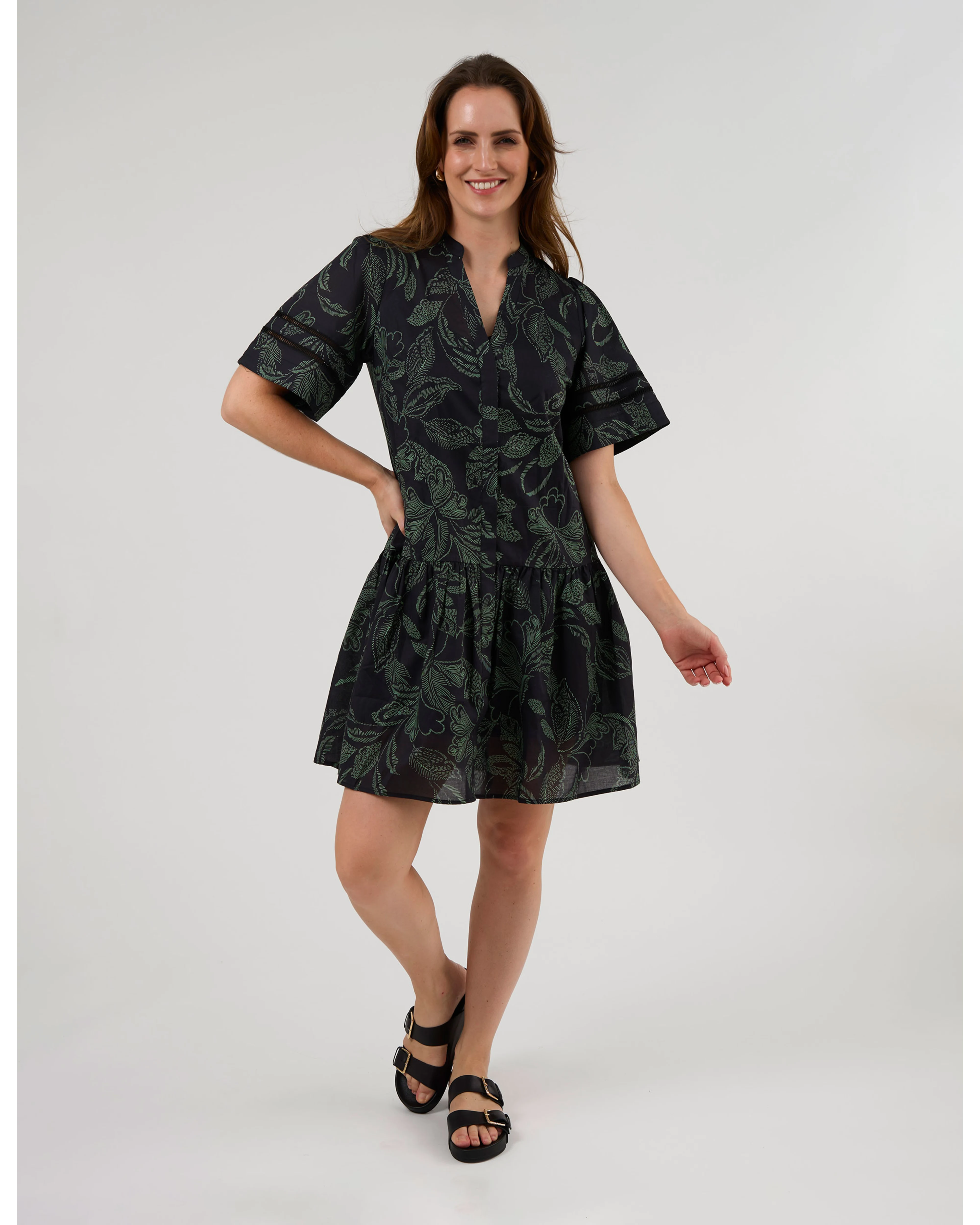 Stella and Gemma Eugenie Dress An Evening In Ibiza. Β V neck knee length dress with concealed button placket, tiered skirt and ladder stitch detail through a fluted sleeve in 100% Cotton.