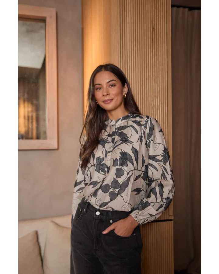 Stella and Gemma Faye Blouse Moonlit Steam. Stunning relaxed fit blouse with mandarin collar, concealed placket and elasticated cuff.