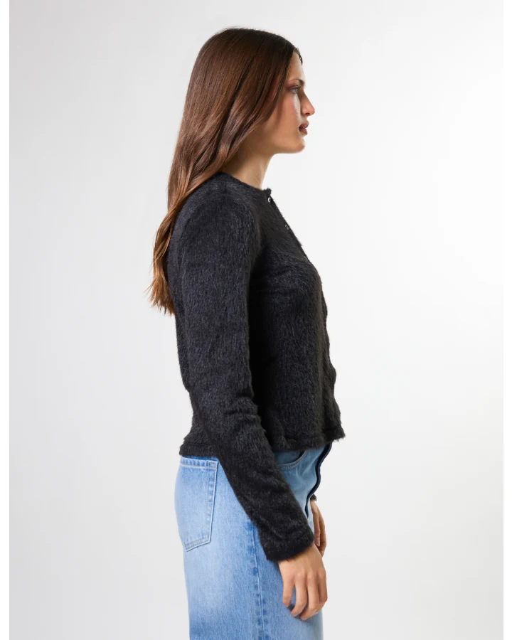 Stella and Gemma Flossie Cardigan Black. Super cute slim fit furry knit button front crew neck cardigan. Wear buttoned up or open as a cardigan this is a versatile piece for your new season wardrobe at a great price point. 96% Polyester and 4% Spandex.