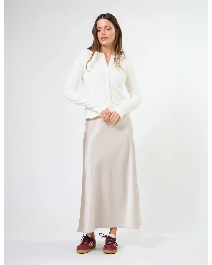 Stella and Gemma Flossie Cardigan Ice Cream. Super cute slim fit furry knit button front crew neck cardigan. Wear buttoned up or open as a cardigan this is a versatile piece for your new season wardrobe at a great price point. 96% Polyester and 4% Spandex.