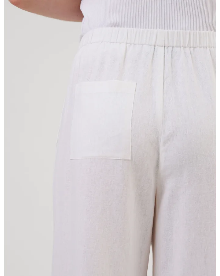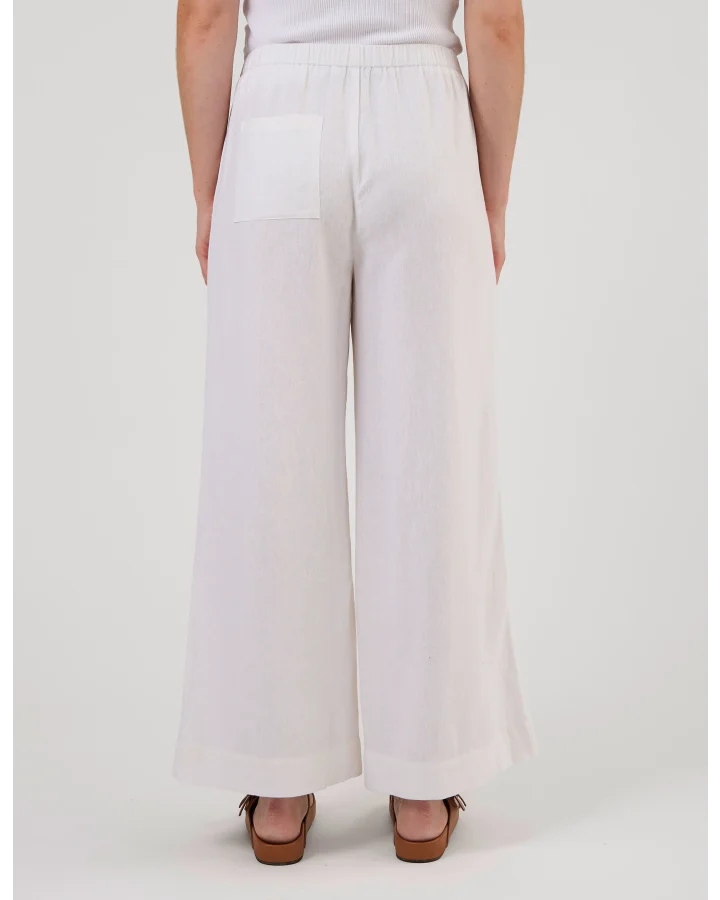 Stella and Gemma Ginny Pant White. Ankle length wide leg relaxed fit pant with fully elasticated waist, side seam pockets and one back patch pocket. 55% Linen 45% Viscose