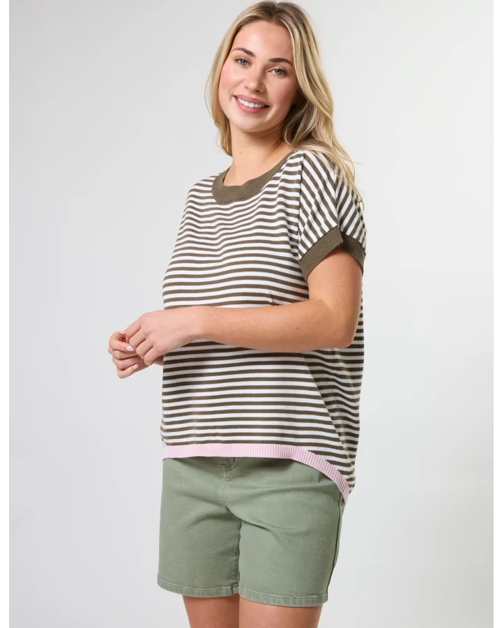 Stella and Gemma Laneway Pocket Top Khaki White Stripe