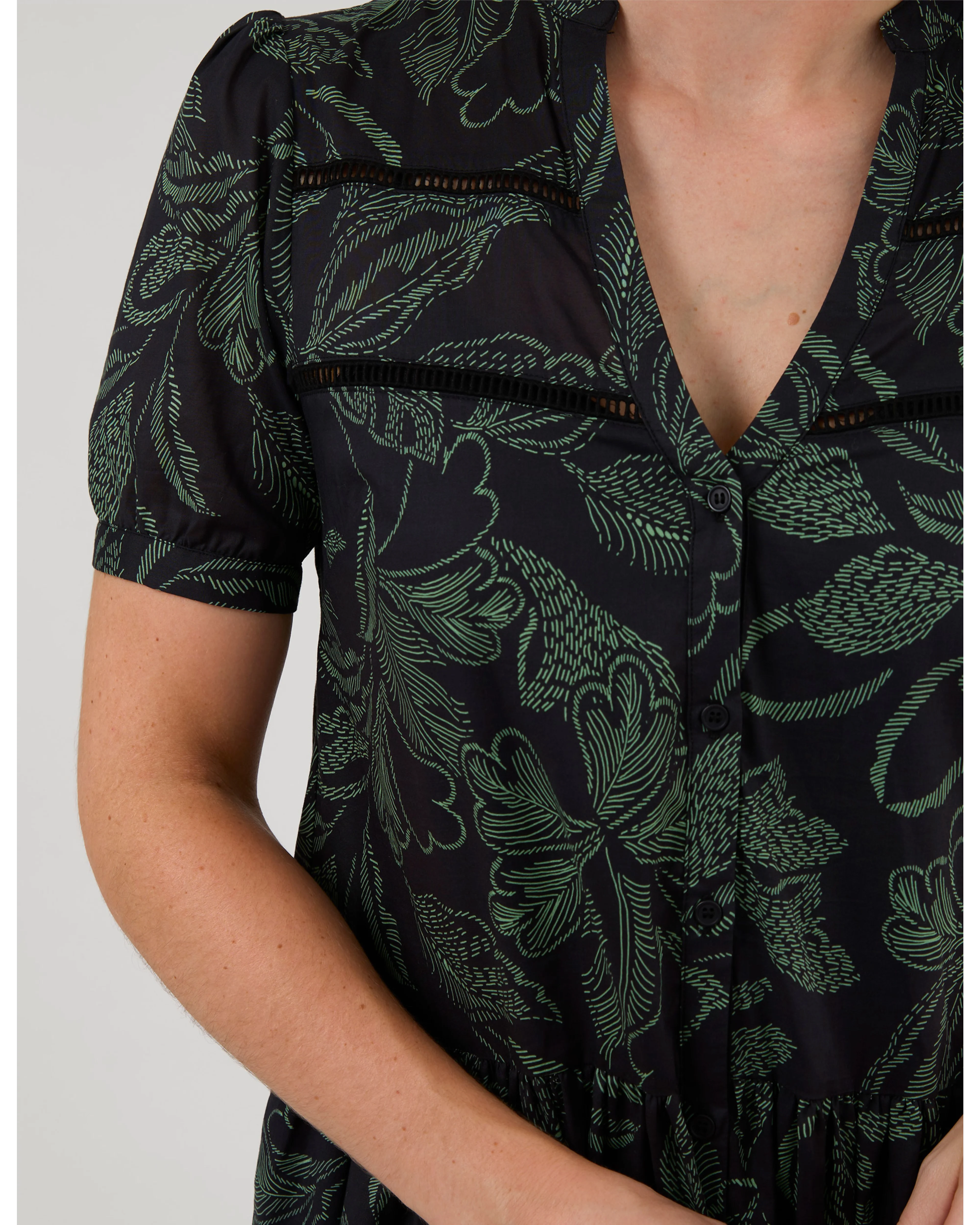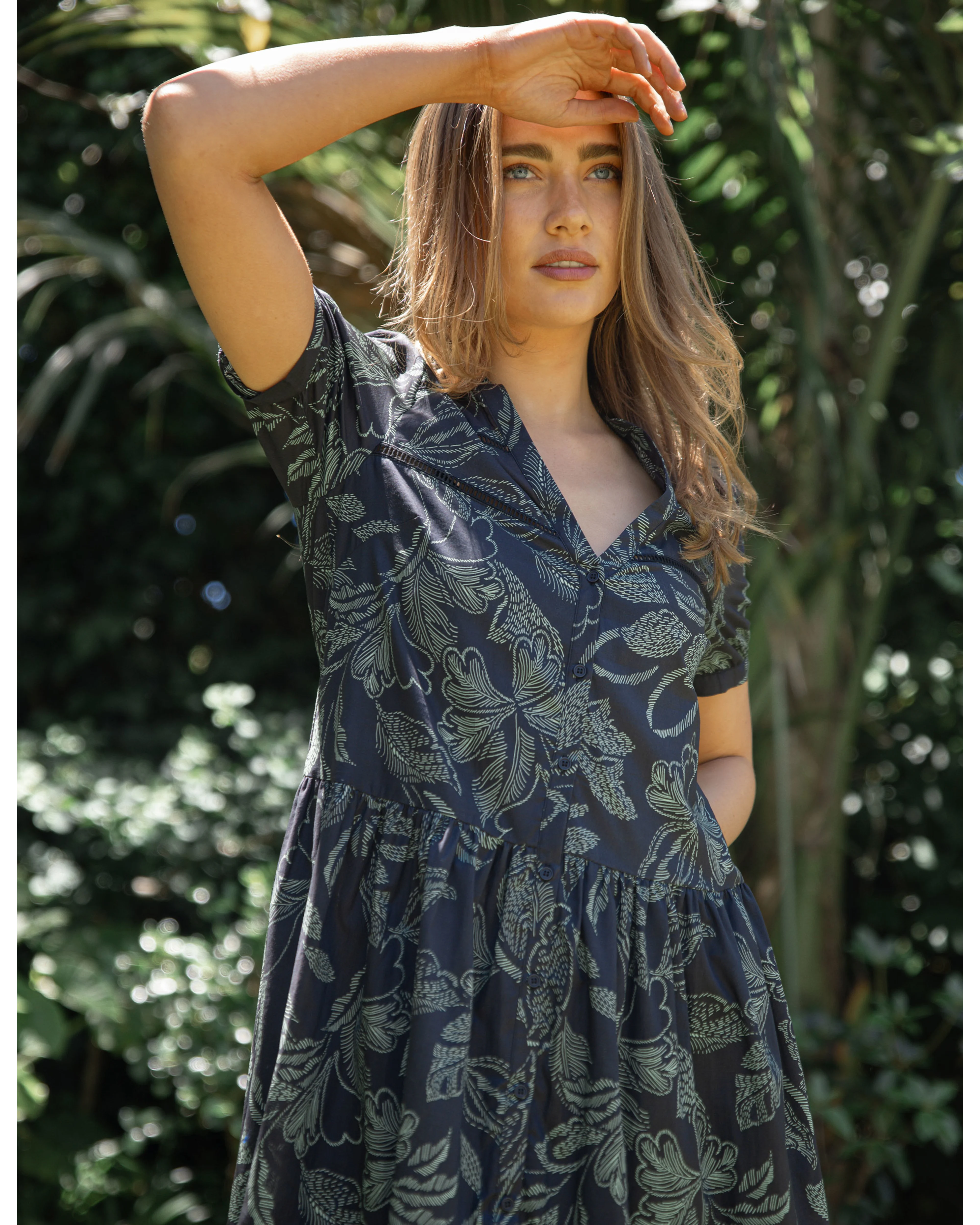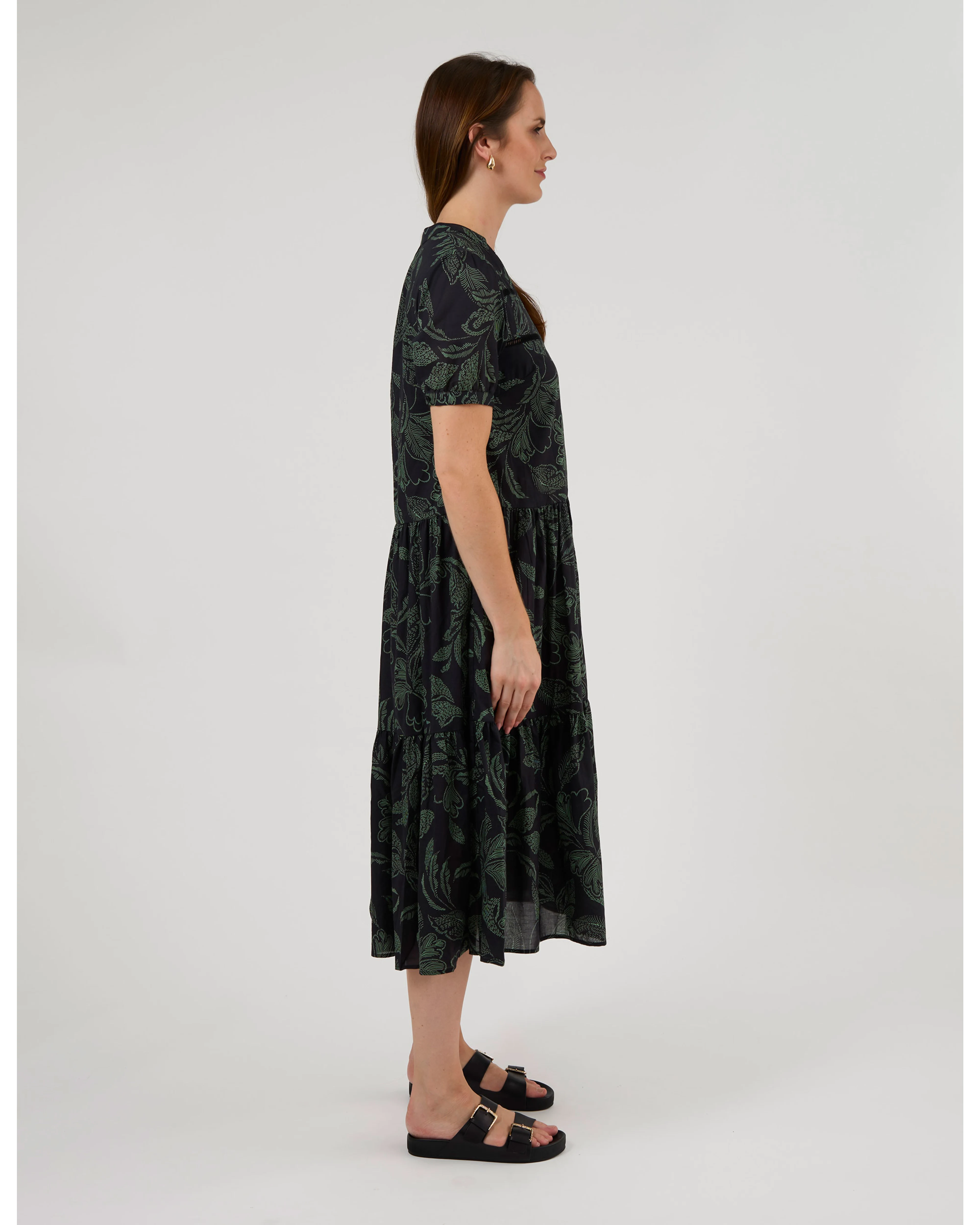 Stella and Gemma Maxine Dress An Evening In Ibiza. V neck ankle length dress with button front, tiered panels and ladder stitch detail through front yok. 100% Cotton.
