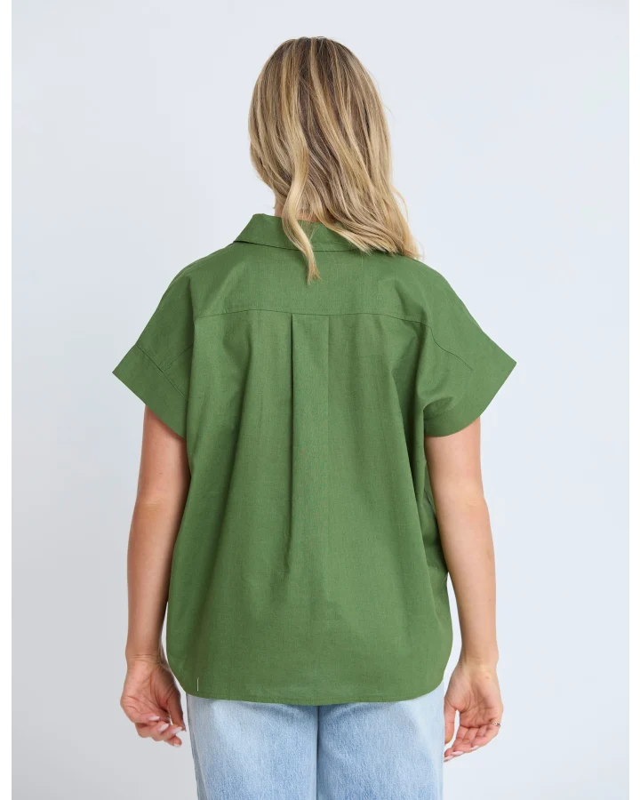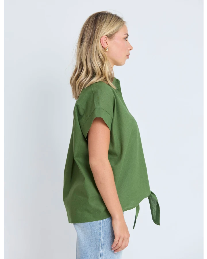 Stella and Gemma Tie the Knot Shirt Emerald. 55% Cotton /45% Linen with drop Shoulder Collared Shirt With Cuffed Sleeve, Contrast Wooden Buttons And Tie Knot Front Hem Detail. Back Yoke Pleat Detail