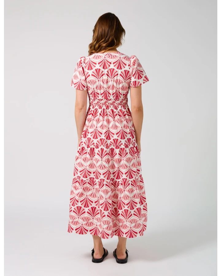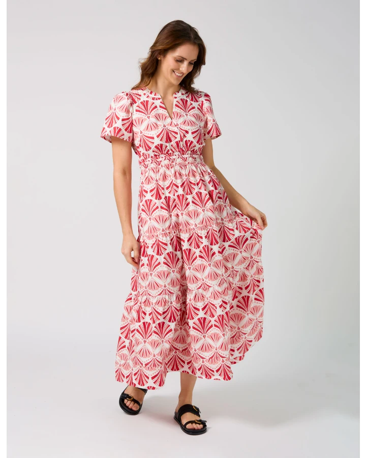 Stella and Gemma Vittoria Dress Sorbet in Sicily. Our best selling dress design is back in super cute sicily red design. Grab it while you can it will sell out. V neck tiered maxi dress with fitted upper bodice , puffed sleeves and elasticated waist