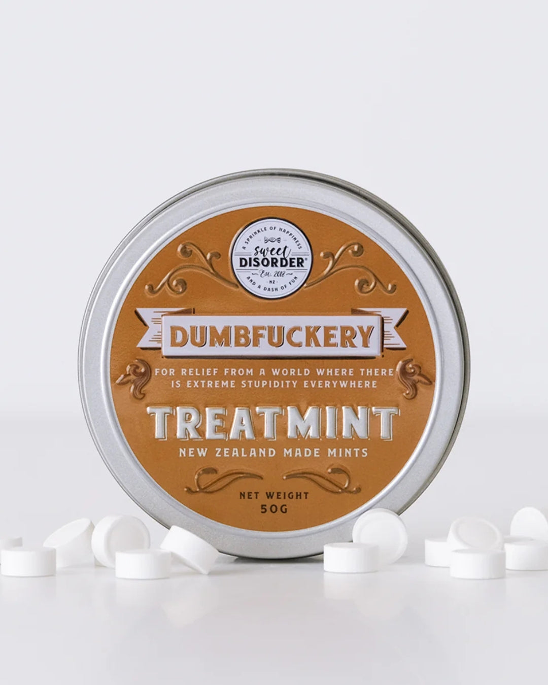 Sweet Disorder Dumbfuckery Treatmints. For relief from a world where there is extreme stupidity everywhere. This quality embossed tin contains New Zealand made refreshing curiously strong mints.