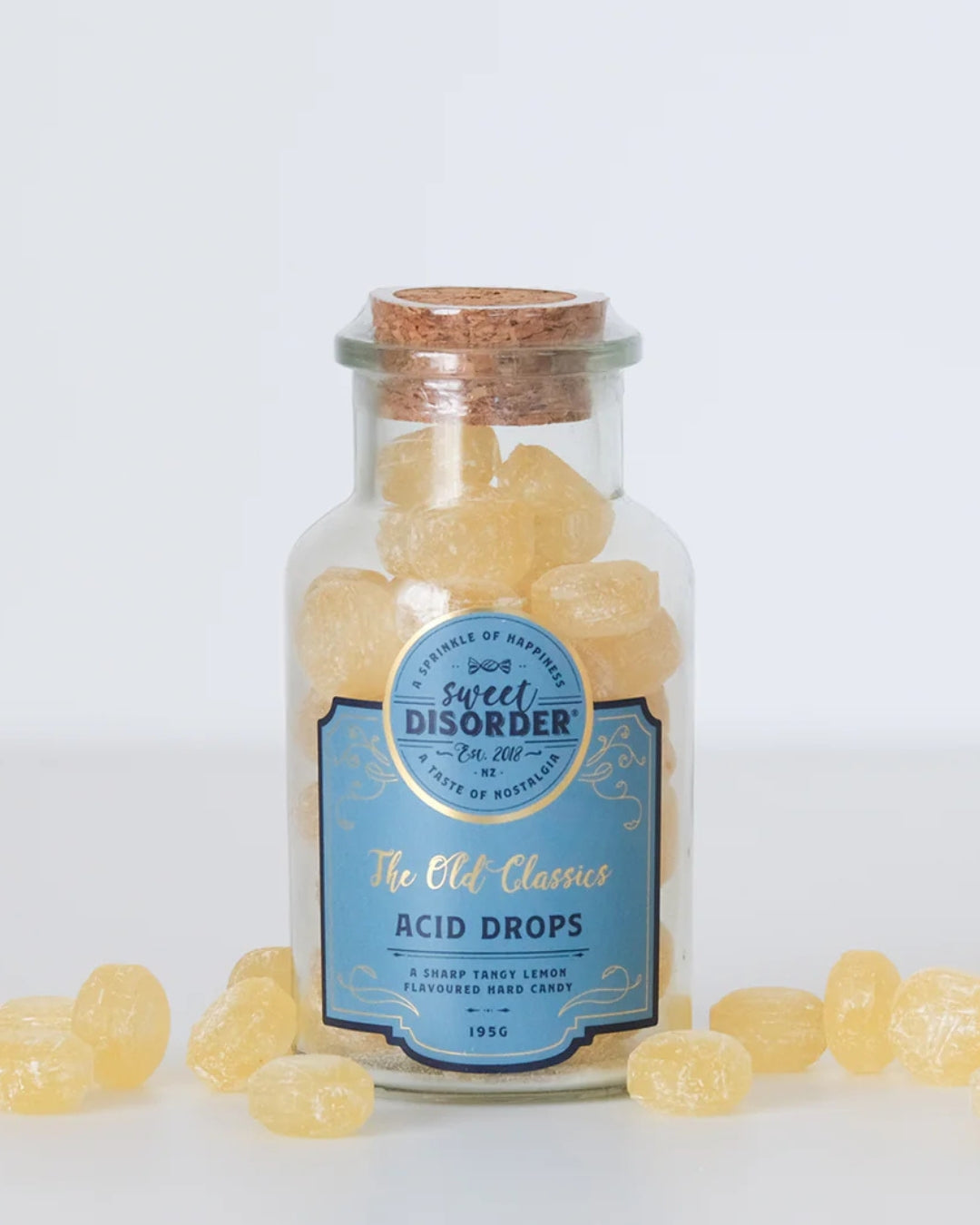 Sweet Disorder Old Classic Sweets Acid Drops. Delicious New Zealand made sharp and tangy lemon flavour hard candy.